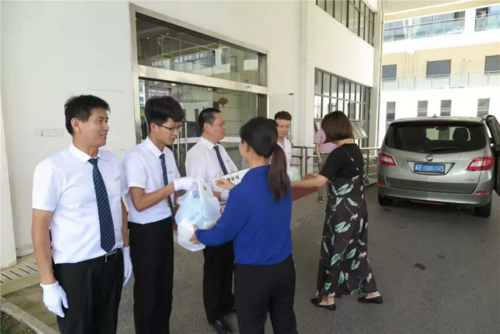 慰问组来到金枫国际小区。厚德物业入驻金枫小区近一年,小区面貌已焕然一新,物业员工付出了辛勤劳动。厚德物业总经理李龙、副总经理潘跃鸣等向工作人员发放了防暑降温用品。